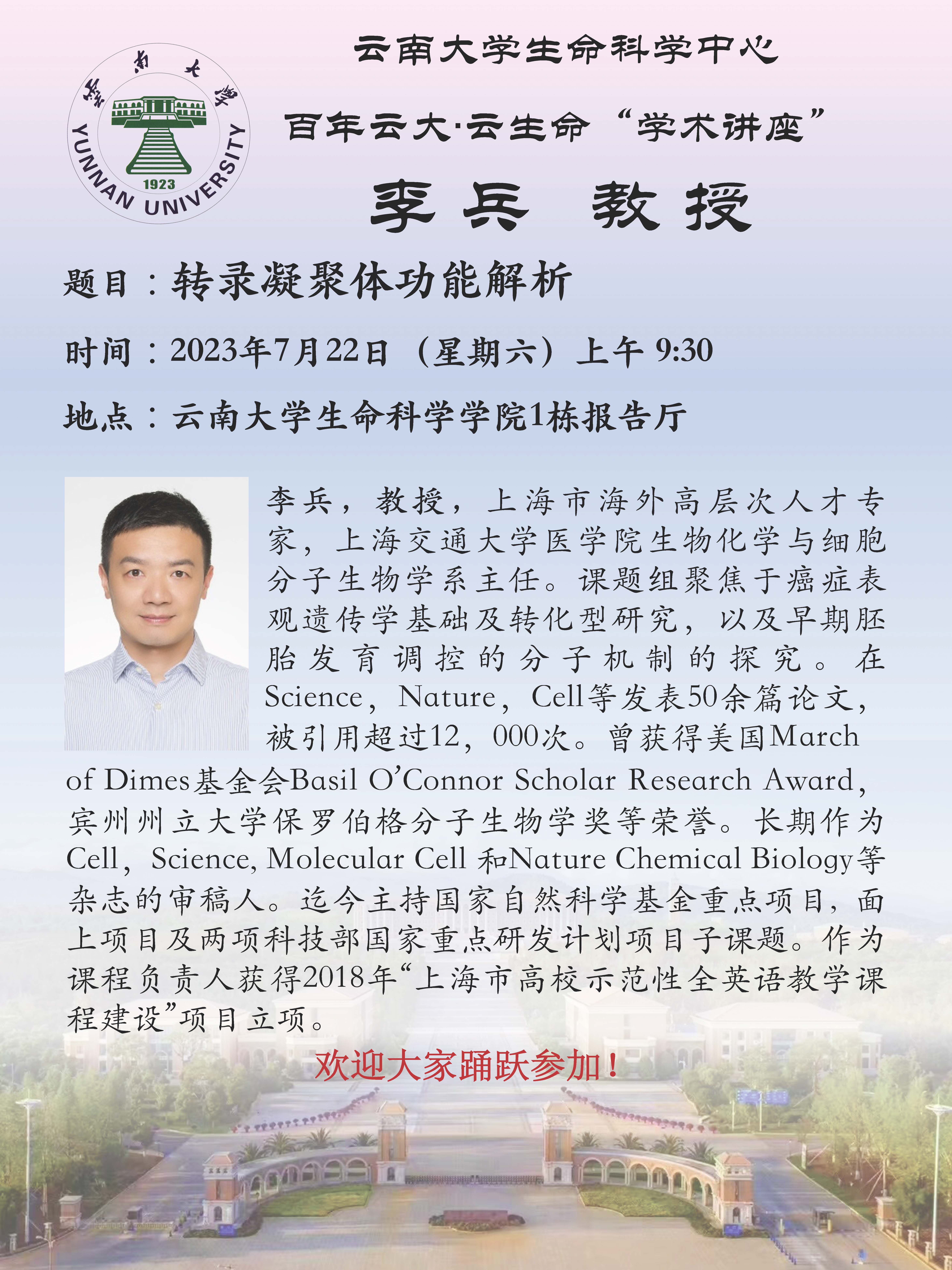 栏目导航 导航 栏目导航 首页 关于我们 太阳成集团tyc122ccvip简介 党政工团 行政办公 新闻通知 太阳成集团tyc122ccvip新闻 通知公告 团队队伍 细胞生物学 生物化学与分子生物学 遗传学 微生物学 生物信息学 进化生物学 当前位置: 首页>>讲座信息>>学术讲座>>正文 转录凝聚体功能解析 发布时间: 2023年07月19日 15:42 阅读次数: