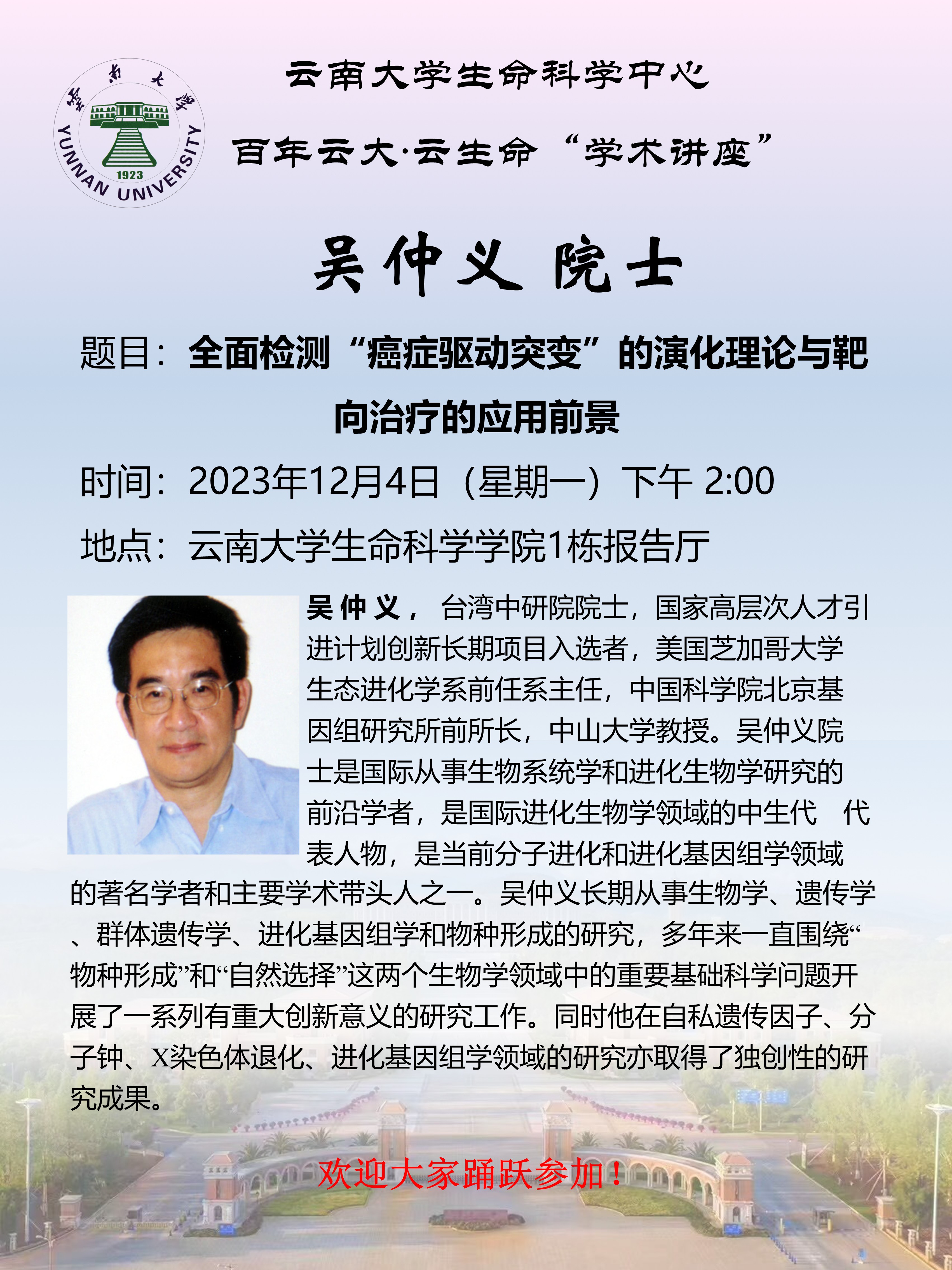 栏目导航 导航 栏目导航 首页 关于我们 太阳成集团tyc122ccvip简介 党政工团 行政办公 新闻通知 太阳成集团tyc122ccvip新闻 通知公告 团队队伍 细胞生物学 生物化学与分子生物学 遗传学 微生物学 生物信息学 进化生物学 当前位置: 首页>>讲座信息>>学术讲座>>正文 全面检测“癌症驱动突变”的演化理论与靶 向治疗的应用前景 发布时间: 2023年12月01日 09:59 阅读次数: