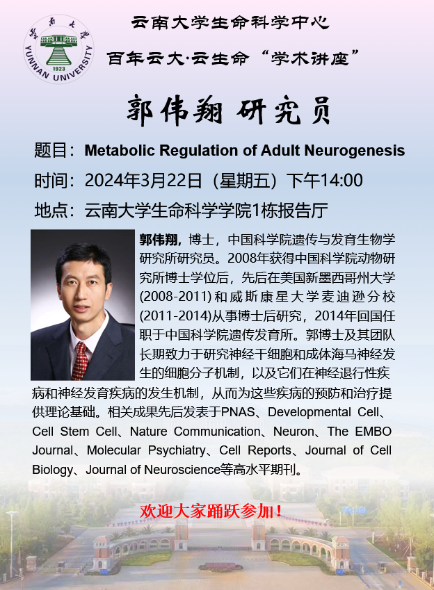 栏目导航 导航 栏目导航 首页 关于我们 太阳成集团tyc122ccvip简介 党政工团 行政办公 新闻通知 太阳成集团tyc122ccvip新闻 通知公告 团队队伍 细胞生物学 生物化学与分子生物学 遗传学 微生物学 生物信息学 进化生物学 当前位置: 首页>>讲座信息>>学术讲座>>正文 Metabolic Regulation of Adult Neurogenesis 发布时间: 2024年03月15日 13:50 阅读次数: