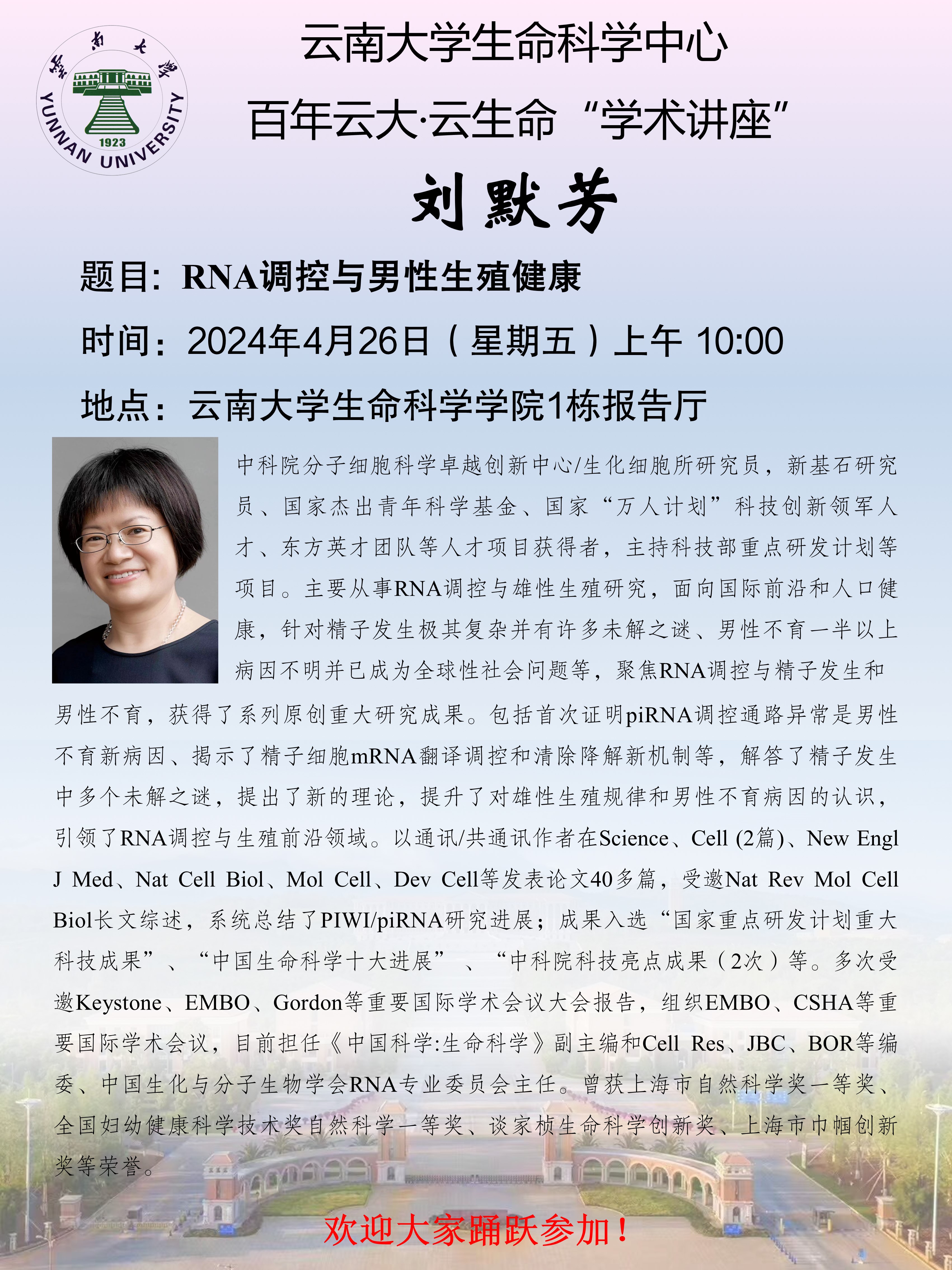 栏目导航 导航 栏目导航 首页 关于我们 太阳成集团tyc122ccvip简介 党政工团 行政办公 新闻通知 太阳成集团tyc122ccvip新闻 通知公告 团队队伍 细胞生物学 生物化学与分子生物学 遗传学 微生物学 生物信息学 进化生物学 当前位置: 首页>>讲座信息>>学术讲座>>正文 RNA调控与男性生殖健康 发布时间: 2024年04月17日 09:41 阅读次数: