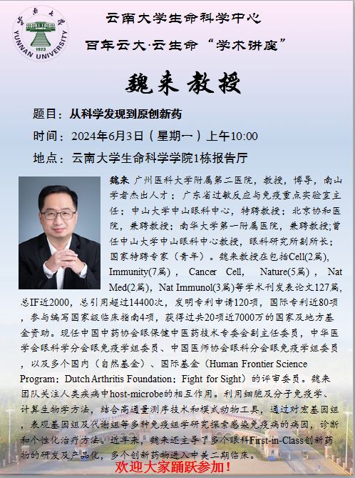 栏目导航 导航 栏目导航 首页 关于我们 太阳成集团tyc122ccvip简介 党政工团 行政办公 新闻通知 太阳成集团tyc122ccvip新闻 通知公告 团队队伍 细胞生物学 生物化学与分子生物学 遗传学 微生物学 生物信息学 进化生物学 当前位置: 首页>>讲座信息>>学术讲座>>正文 从科学发现到原创新药 发布时间: 2024年05月28日 10:59 阅读次数:
