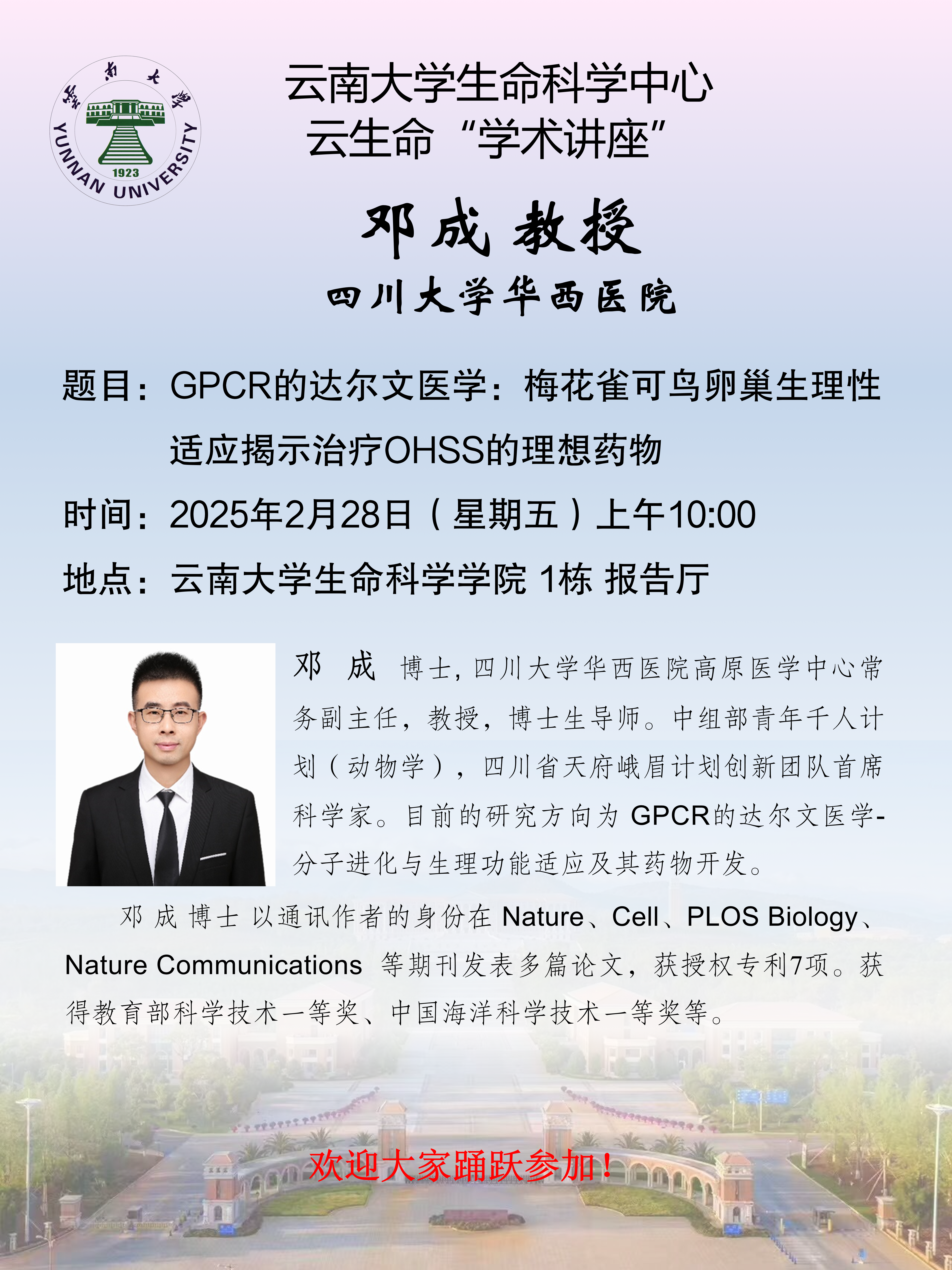 栏目导航 导航 栏目导航 首页 关于我们 太阳成集团tyc122ccvip简介 党政工团 行政办公 新闻通知 太阳成集团tyc122ccvip新闻 通知公告 团队队伍 细胞生物学 生物化学与分子生物学 遗传学 微生物学 生物信息学 进化生物学 当前位置: 首页>>讲座信息>>学术讲座>>正文 GPCR的达尔文医学:梅花雀可鸟卵巢生理性适应揭示治疗OHSS的理想药物 发布时间: 2025年02月26日 09:42 阅读次数: