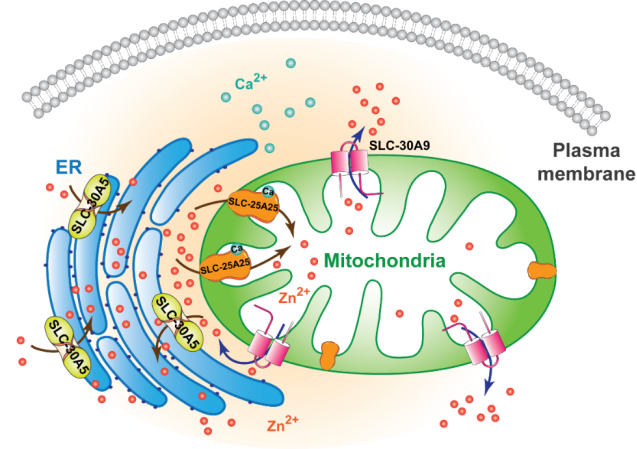 2 一对锌离子转运蛋白SLC-30A9/SLC-25A25共同调控线粒体稳态的机制示意图