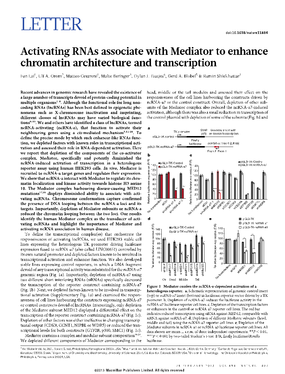 5. Lai F, Orom UA, Cesaroni M, Beringer M, Taatjes DJ, Blobel GA, Shiekhattar R. Activating RNAs associate with Mediator to enhance chromatin architecture and transcription. Nature (2013), 494: 497-501