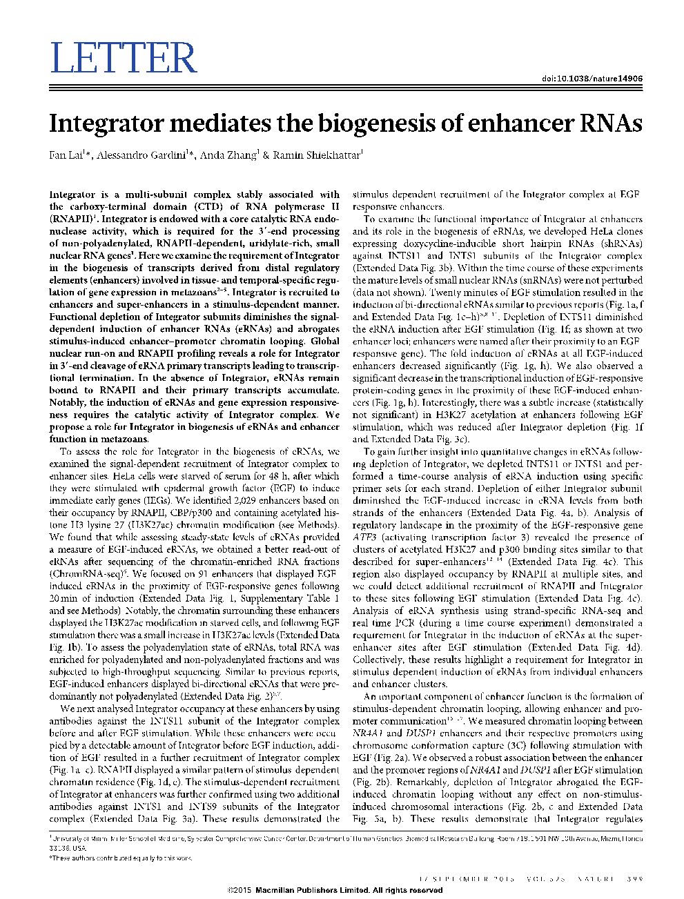 4. Lai F, Gardini A, Zhang A, Shiekhattar R. Integrator mediates the biogenesis of enhancer RNAs. Nature (2015) 525: 399-403;